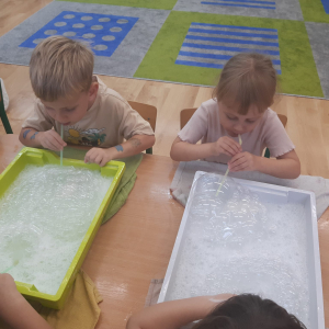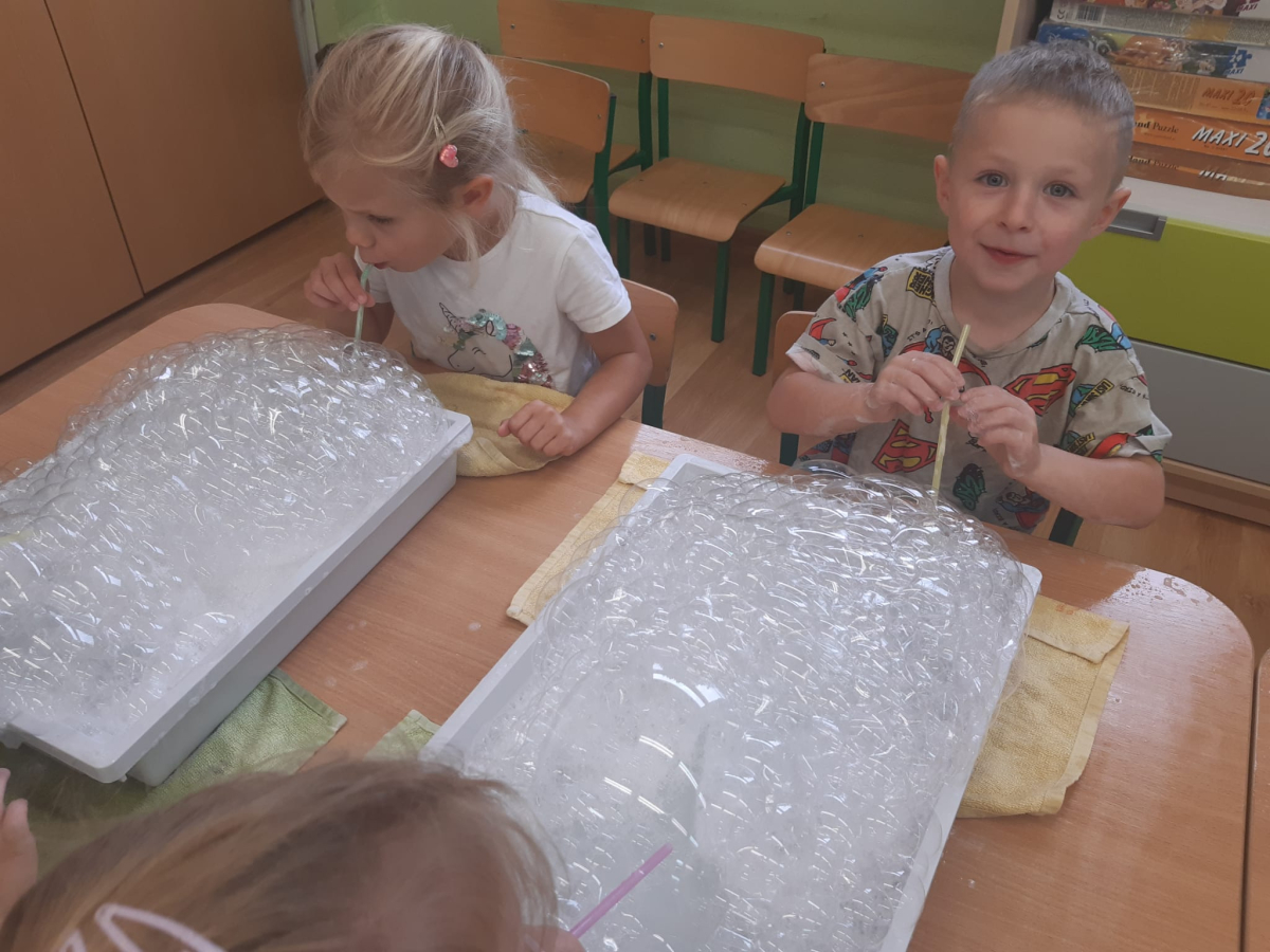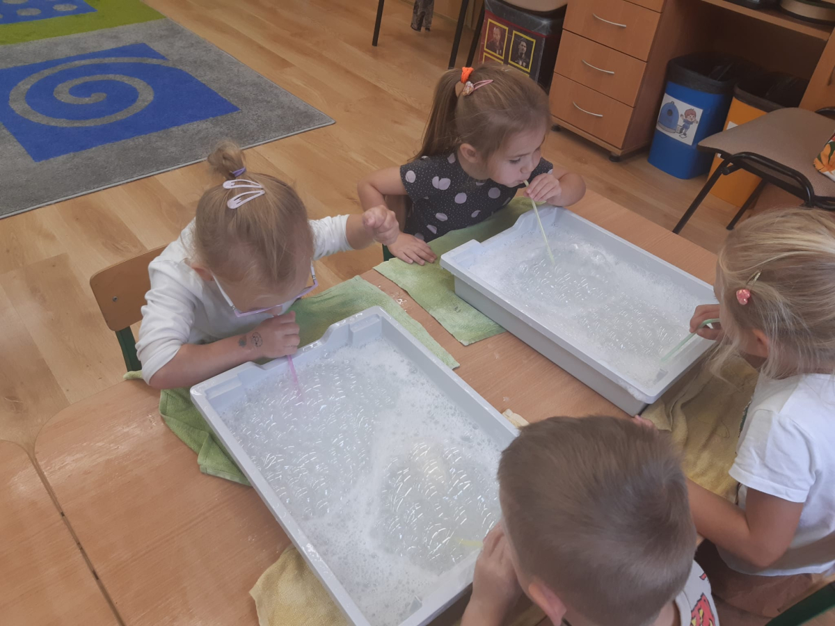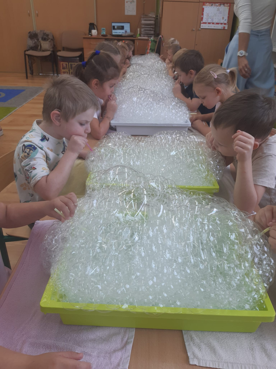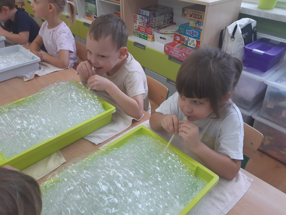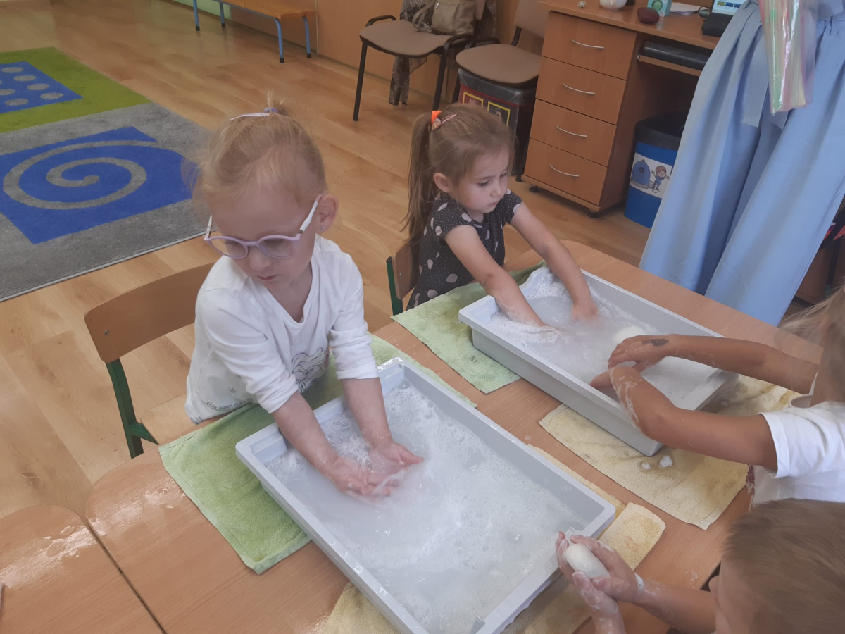 Mydlana zabawa okazała się nie tylko przyjemnym doznaniem sensorycznym, ale też okazją do ćwiczeń doskonalących tor oddechowy. Przede wszystkim jednak sprawiła Zajączkom WIELKĄ RADOŚĆ!