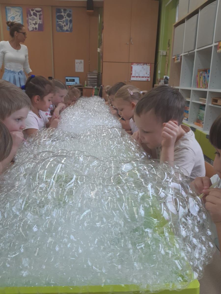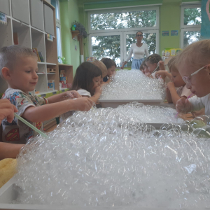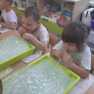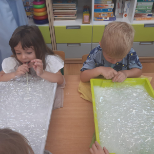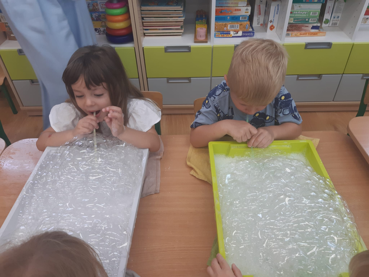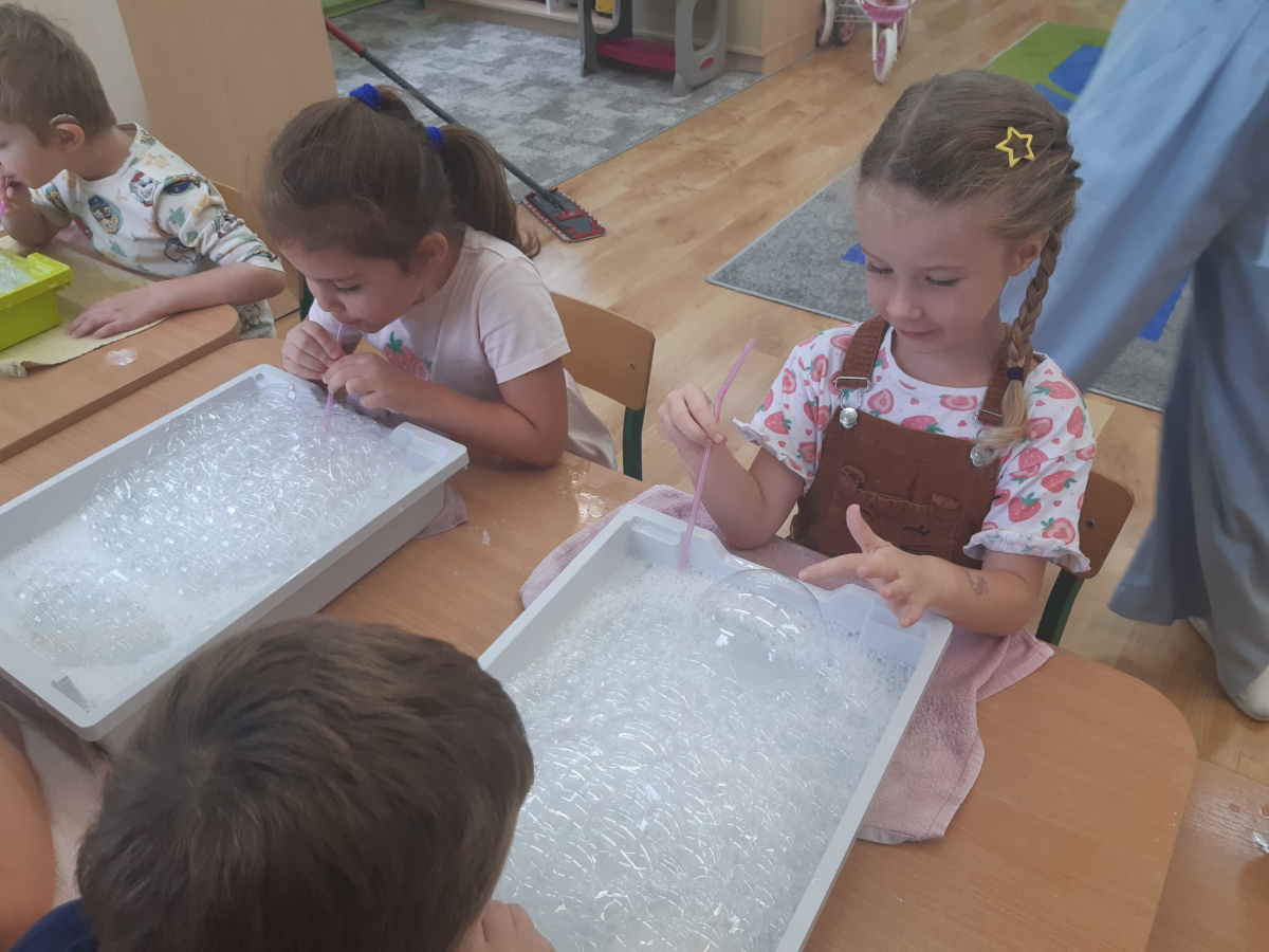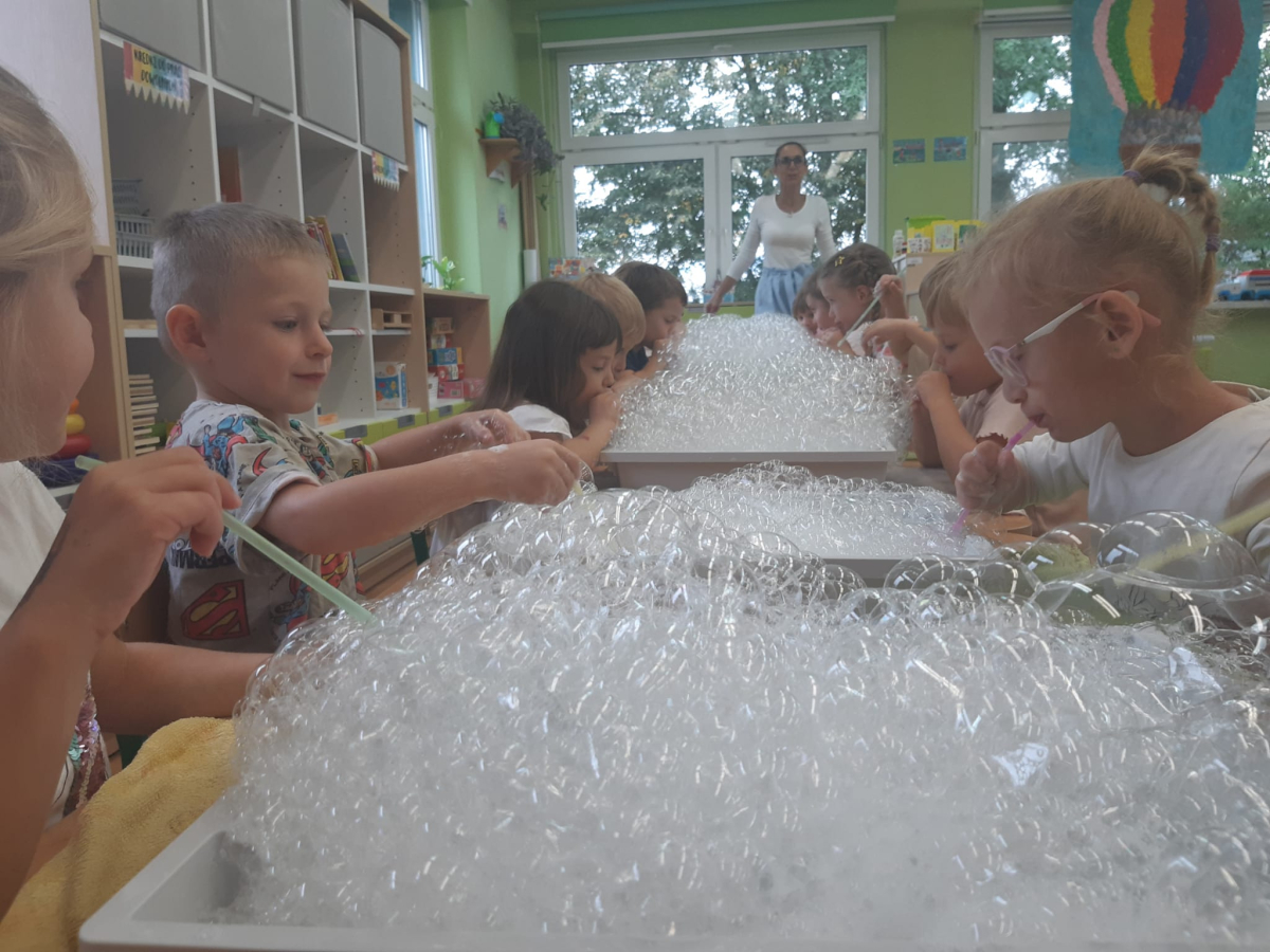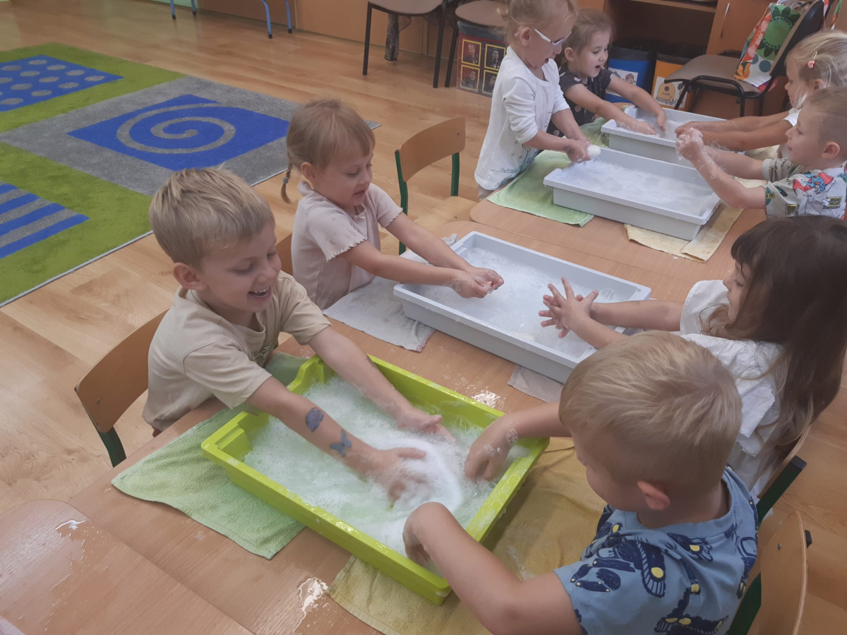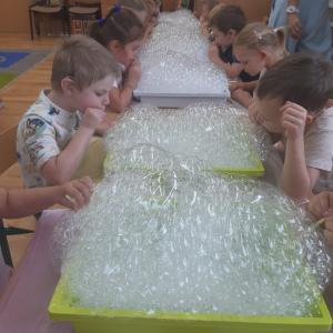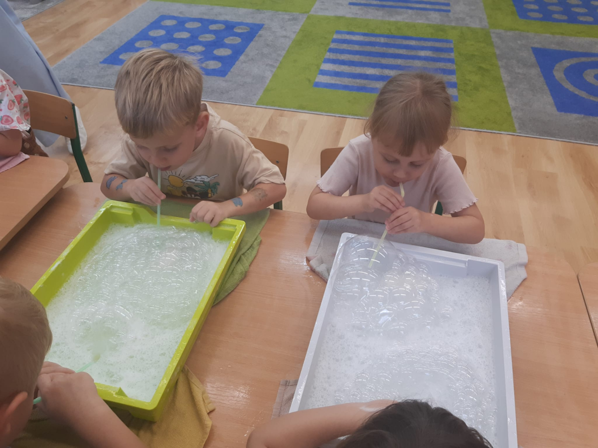 Mydlana zabawa okazała się nie tylko przyjemnym doznaniem sensorycznym, ale też okazją do ćwiczeń doskonalących tor oddechowy. Przede wszystkim jednak sprawiła Zajączkom WIELKĄ RADOŚĆ!