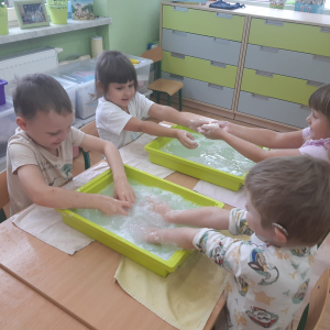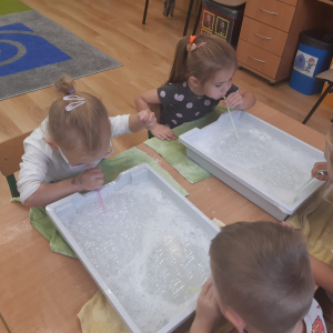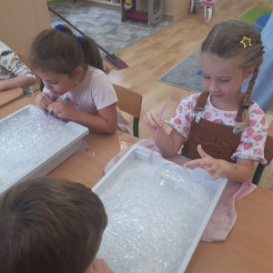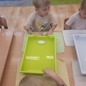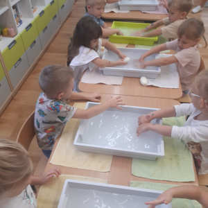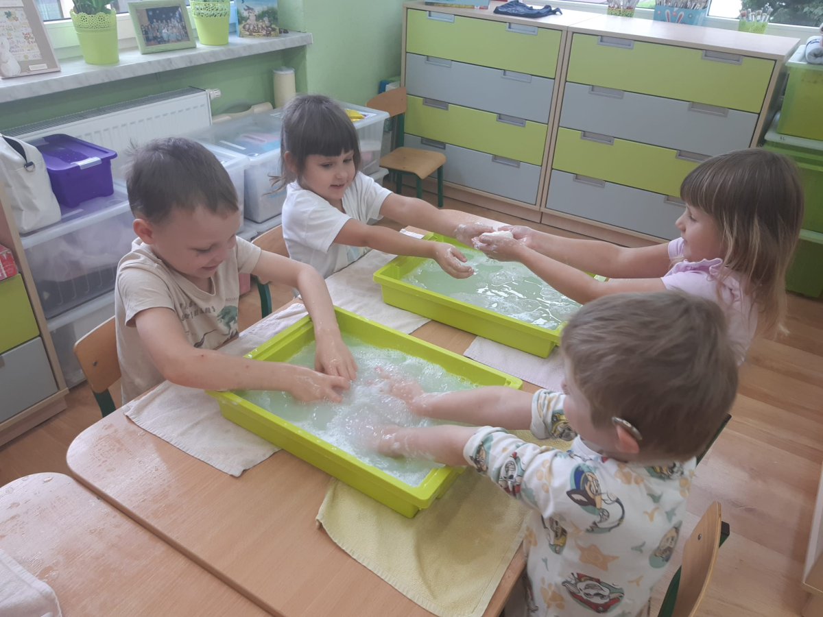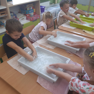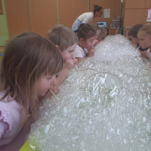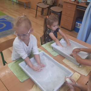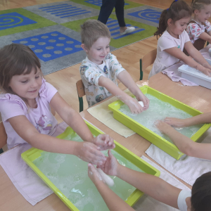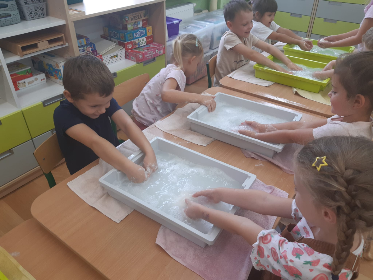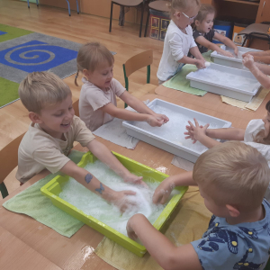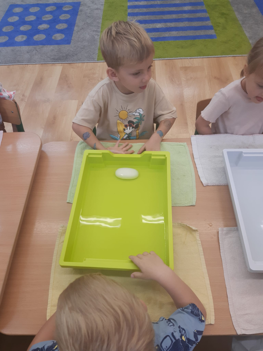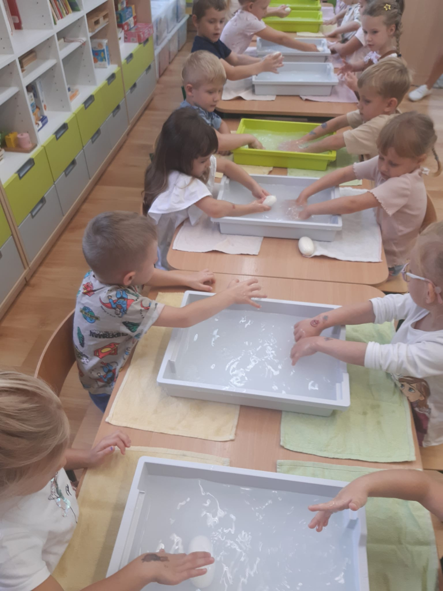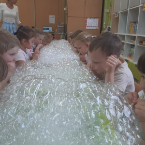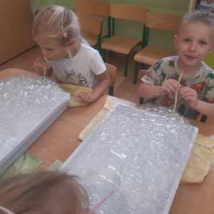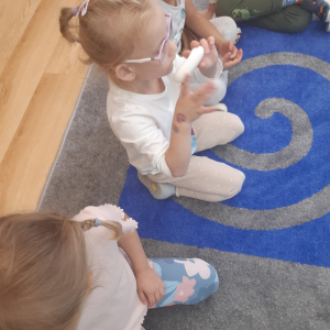 Mydlana zabawa okazała się nie tylko przyjemnym doznaniem sensorycznym, ale też okazją do ćwiczeń doskonalących tor oddechowy. Przede wszystkim jednak sprawiła Zajączkom WIELKĄ RADOŚĆ!