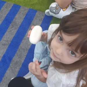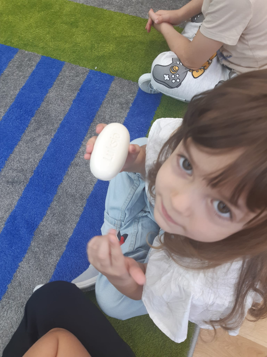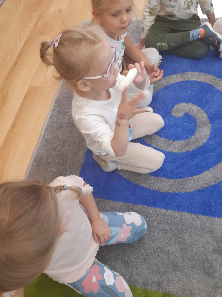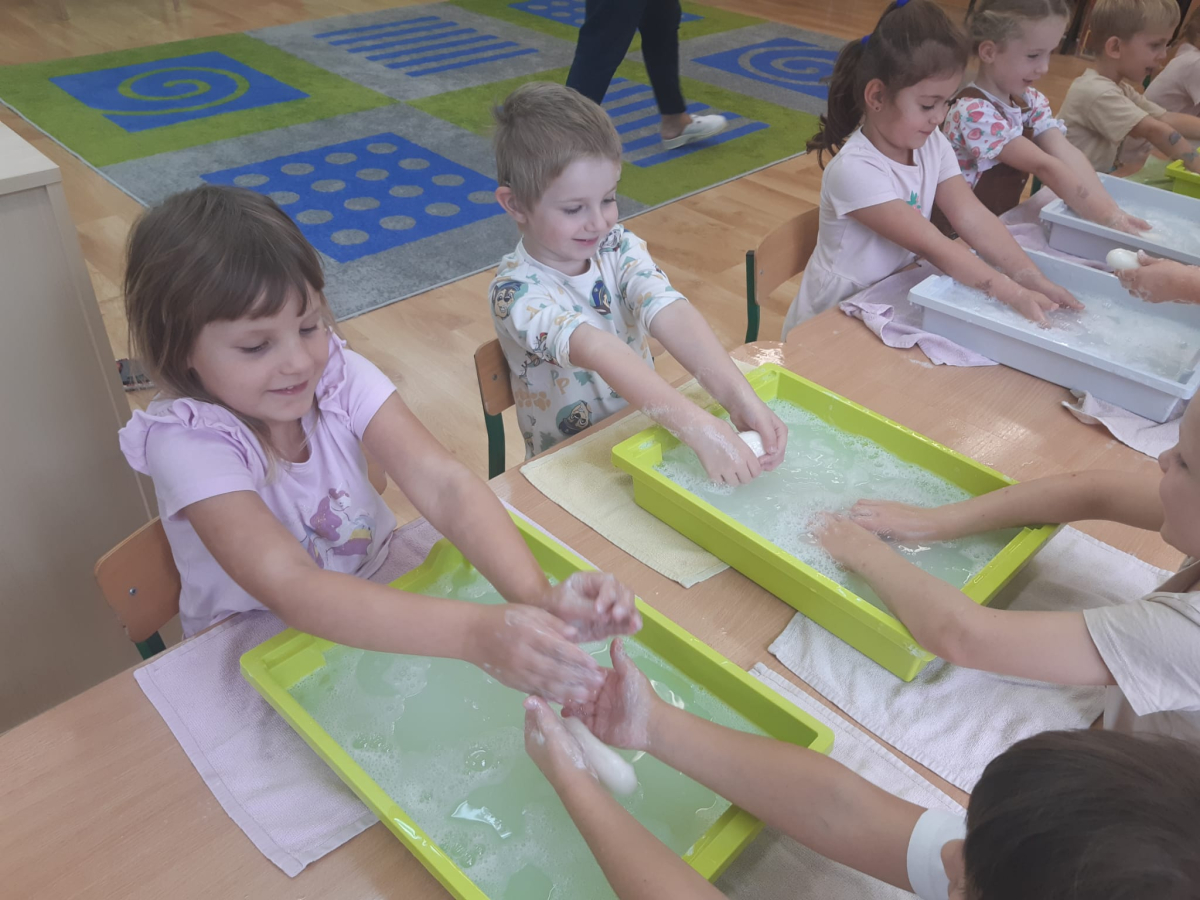 Korzystając ze swoich doświadczeń oraz wiadomości wyniesionych z programu, dzieci potrafiły doskonale wskazać prawidłowe nawyki higieniczne. Na zakończenie zajęć Zajączki, zgodnie ze słowami popularnej piosenki, bawiły się z mydłem w berka i nie tylko.
