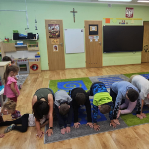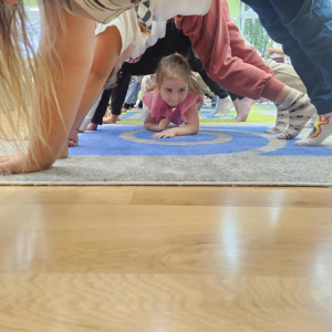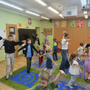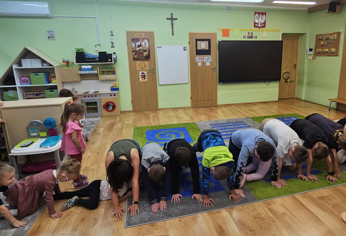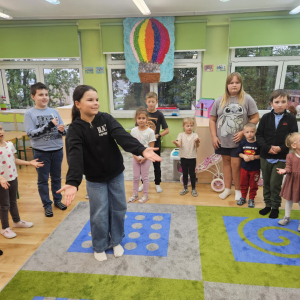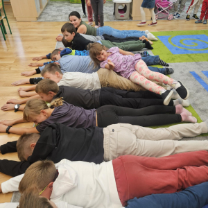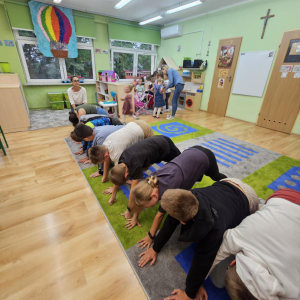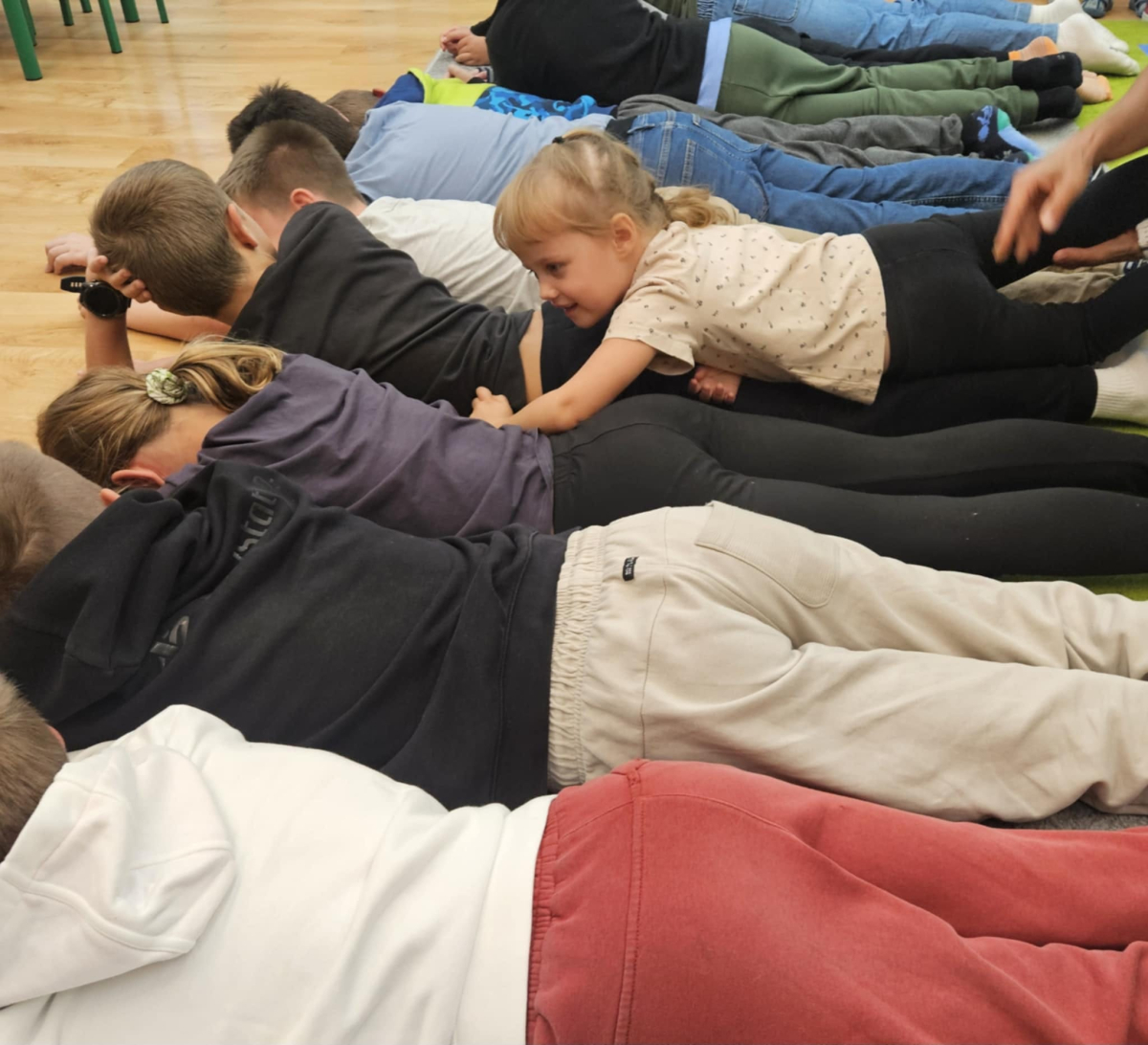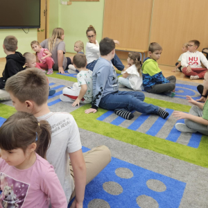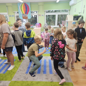 Starsze dzieci przeczytały przedszkolakom bajkę przygotowaną specjalnie na to spotkanie, a później wszyscy razem bawili się i ćwiczyli, korzystając z metody Ruchu Rozwijającego Weroniki Sherborne.