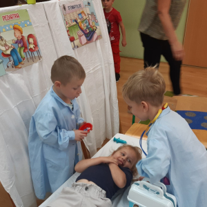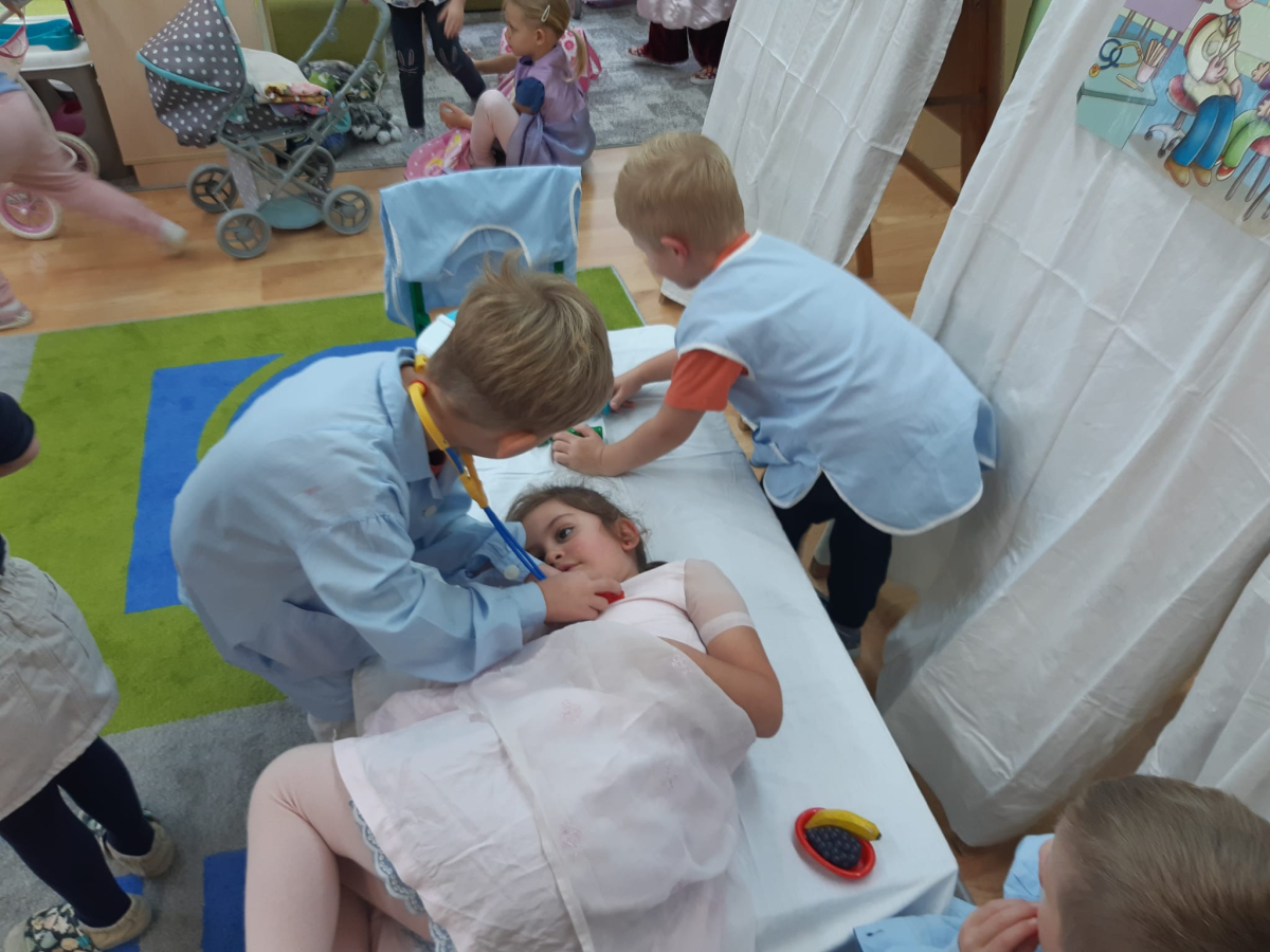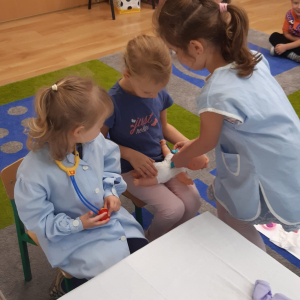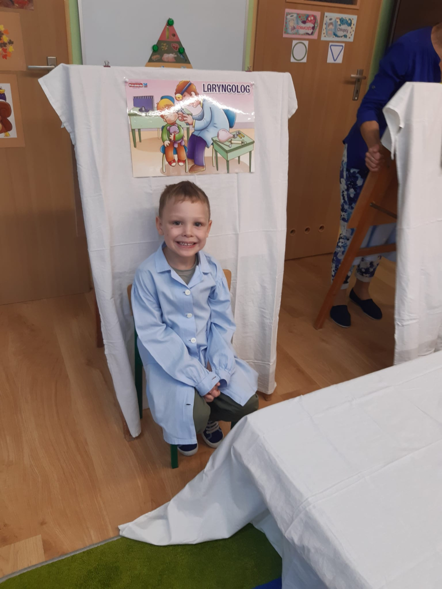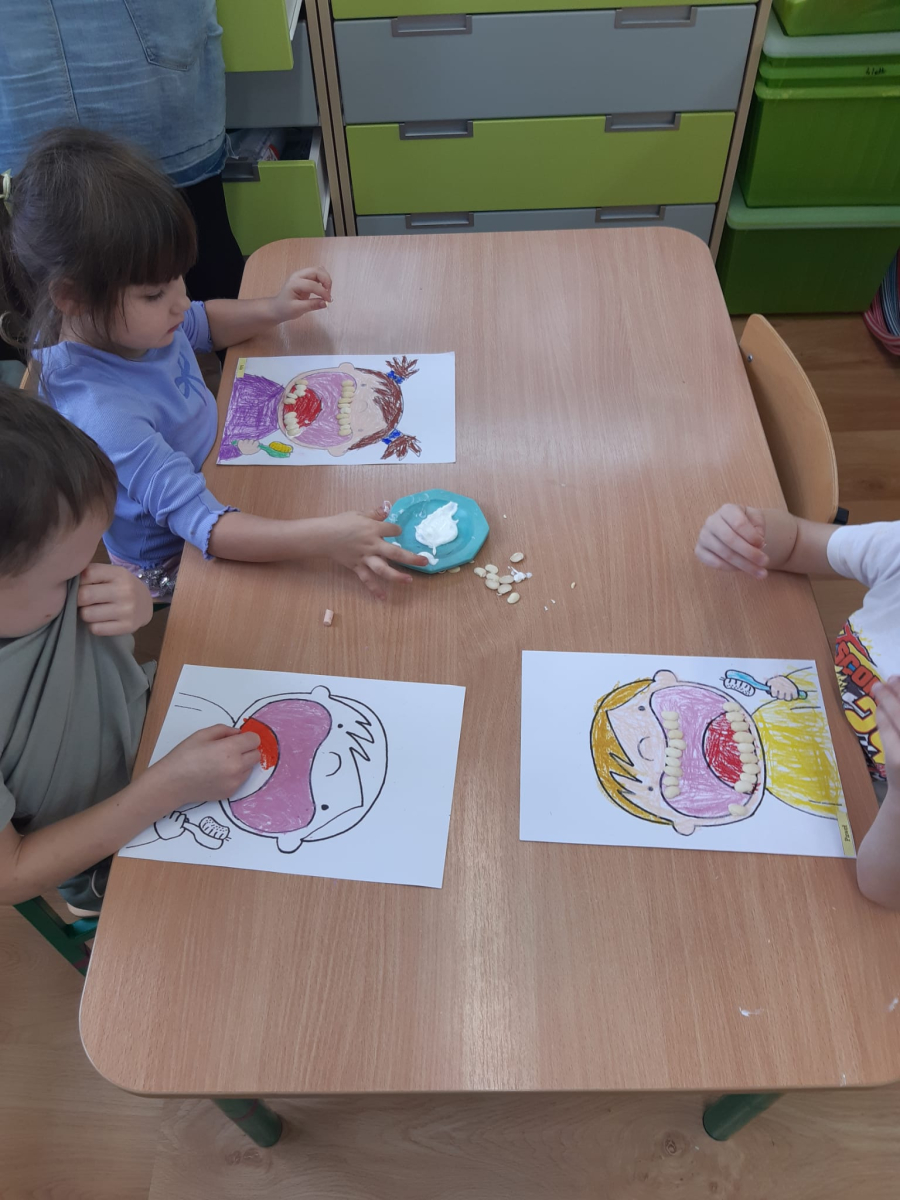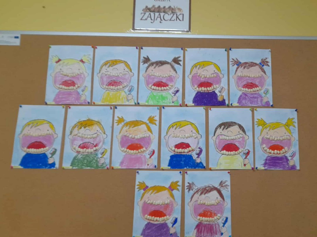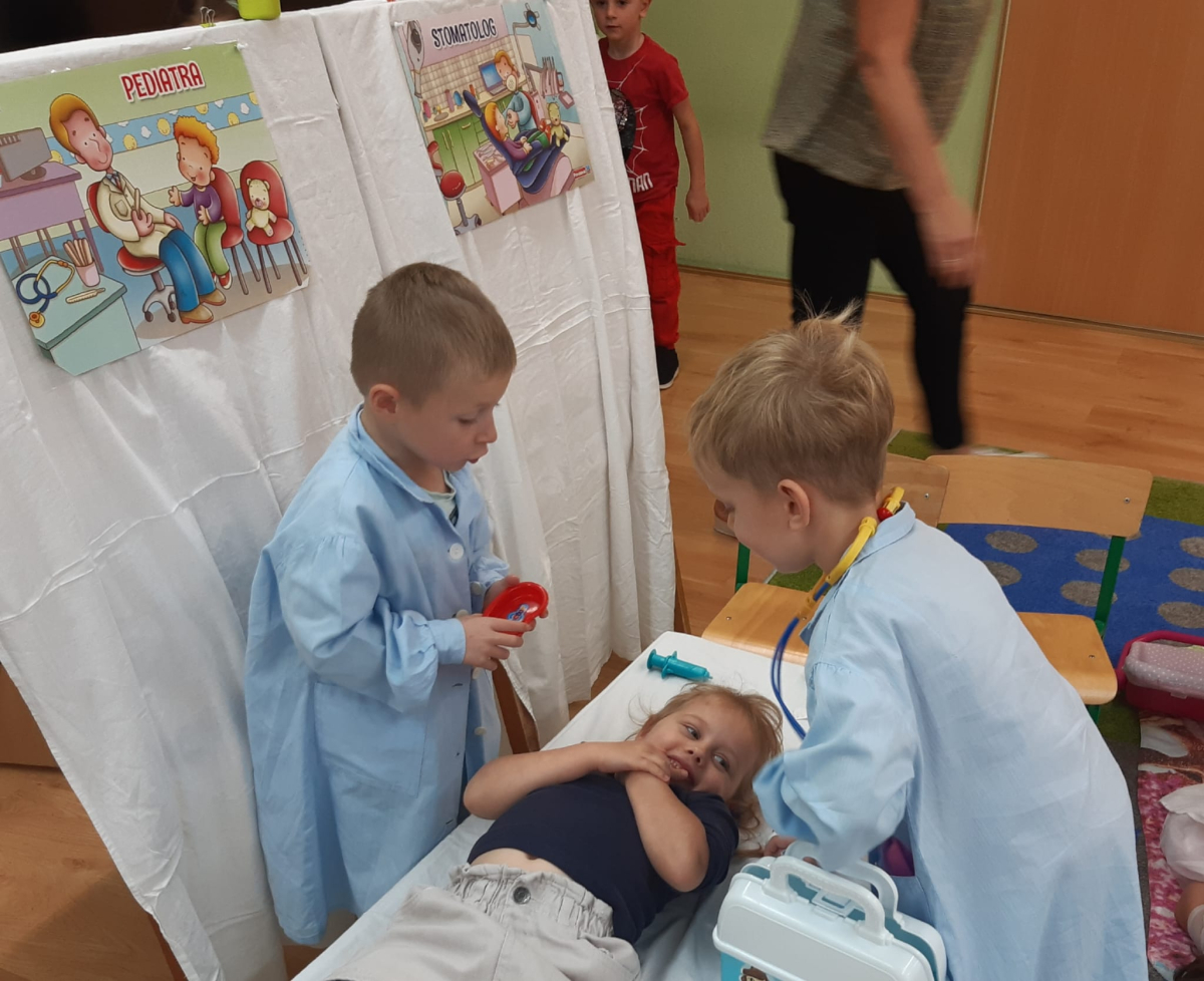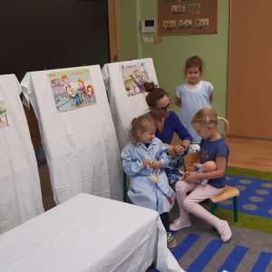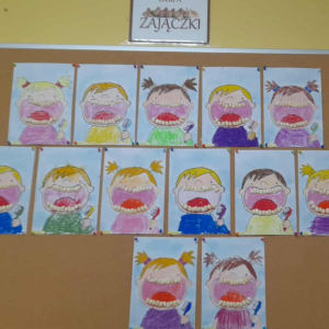 Podczas zajęć, grupa Zajączków rozmawiała na temat chorowania i leczenia. Ponieważ niestety, każde z dzieci było kiedyś chore, to mogły podzielić się swoimi doświadczeniami i obawami związanymi z wizytą u lekarza. Podczas rozmów na ten temat dzieci dowiedziały się również, że swoje dolegliwości można leczyć u różnych lekarzy. Dzieci miały też okazję wcielić się w rolę różnych specjalistów i mogły leczyć swoich małych pacjentów. Zabawa sprawiła dzieciom ogromne radość i satysfakcję. Miejmy również nadzieję, że zajęcia pomogą dzieciom w przyszłości przezwyciężyć lęk podczas wizyty u lekarza. Na koniec aby utrwalić wiedzę dotycząca dbania o ząbki, dzieci wykonała pracę plastyczną. Powstały radosne buzie pełne zdrowych i zadbanych zębów.