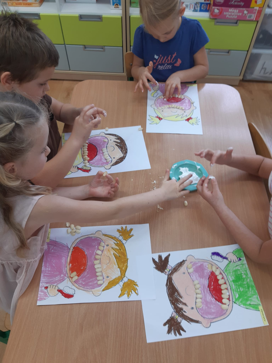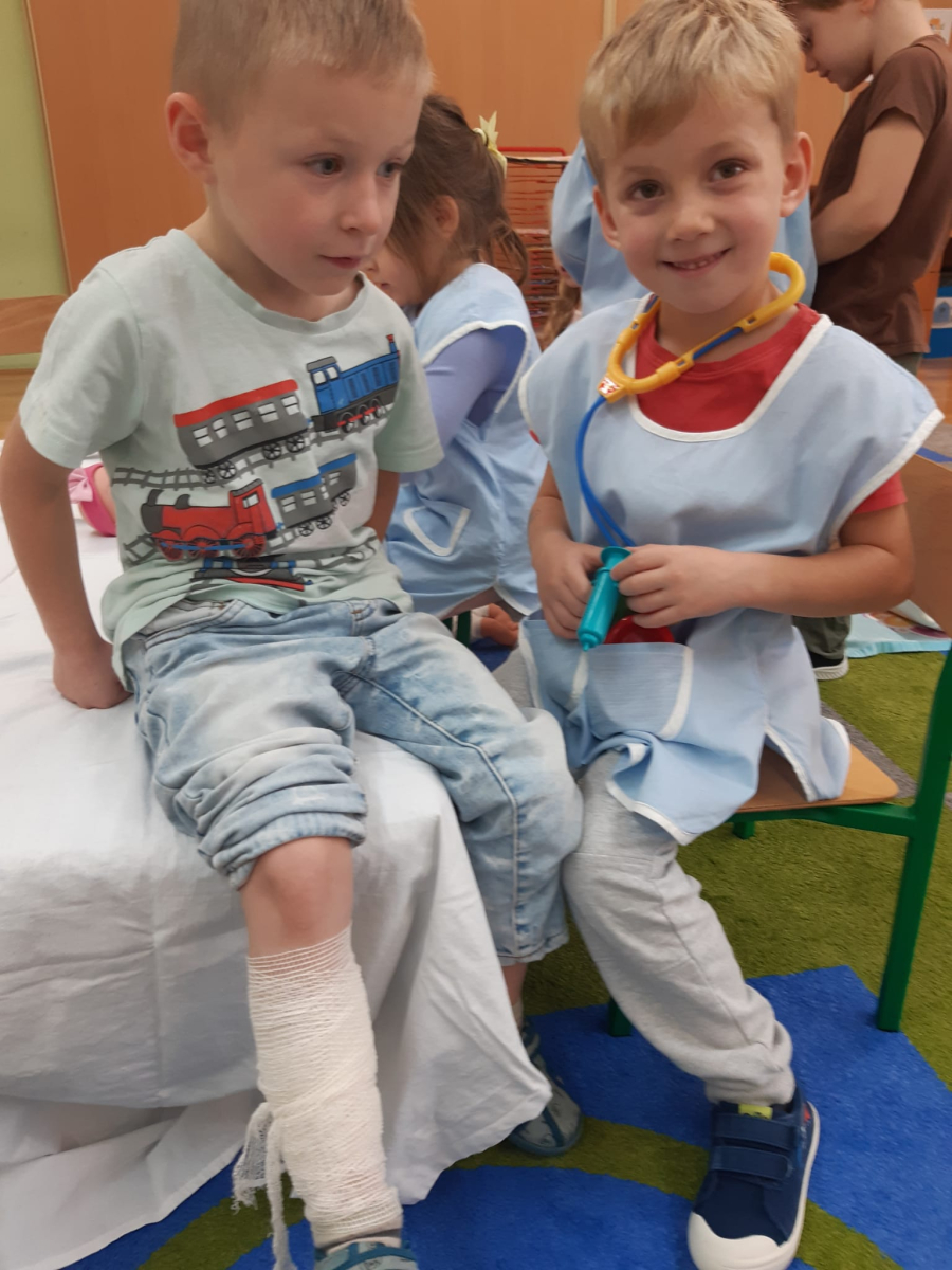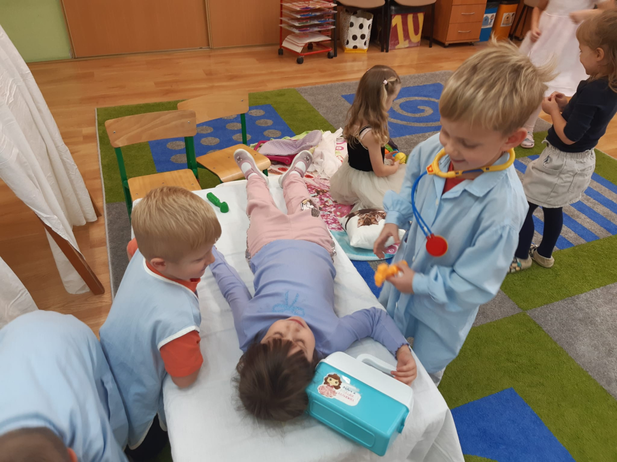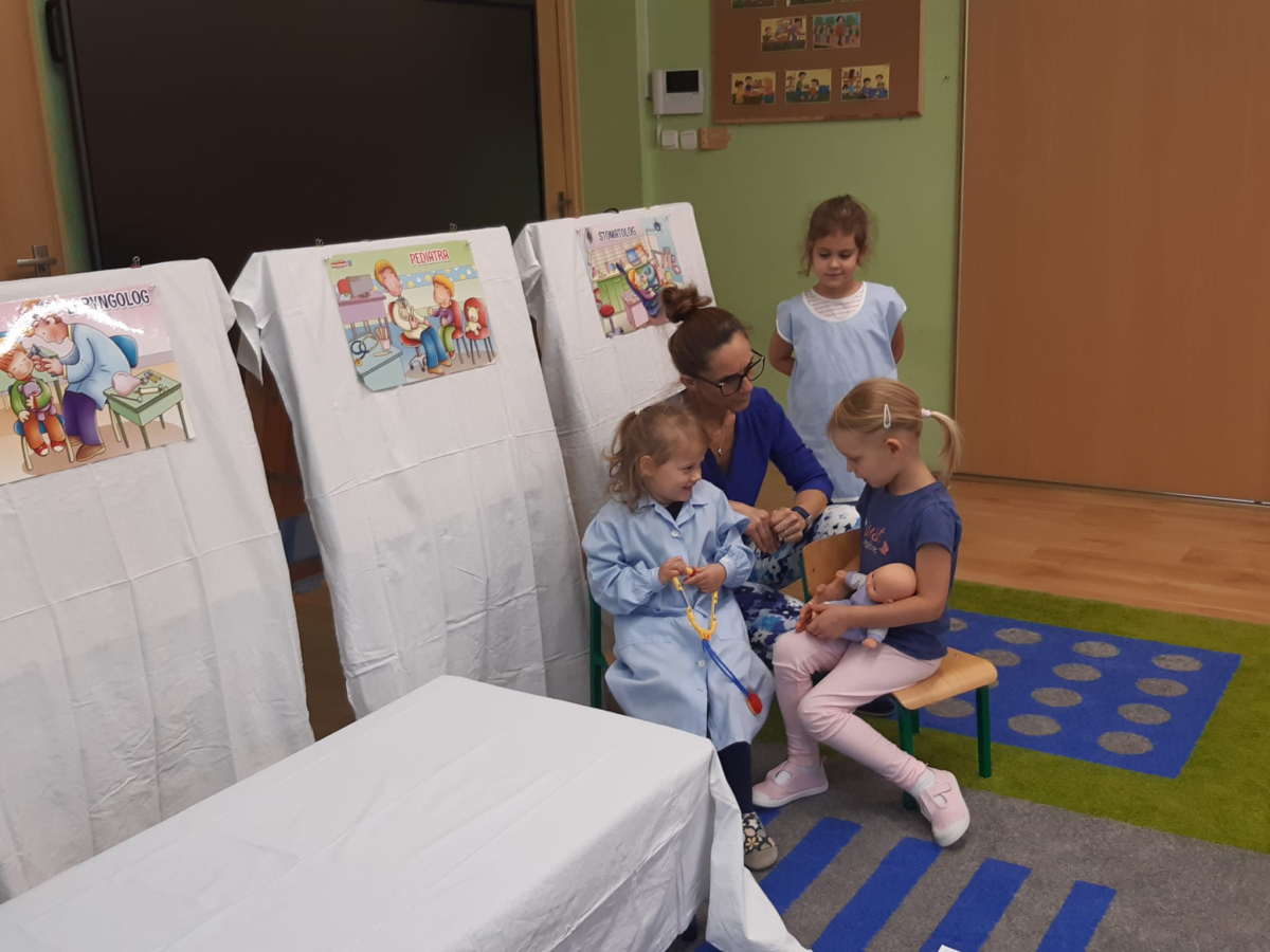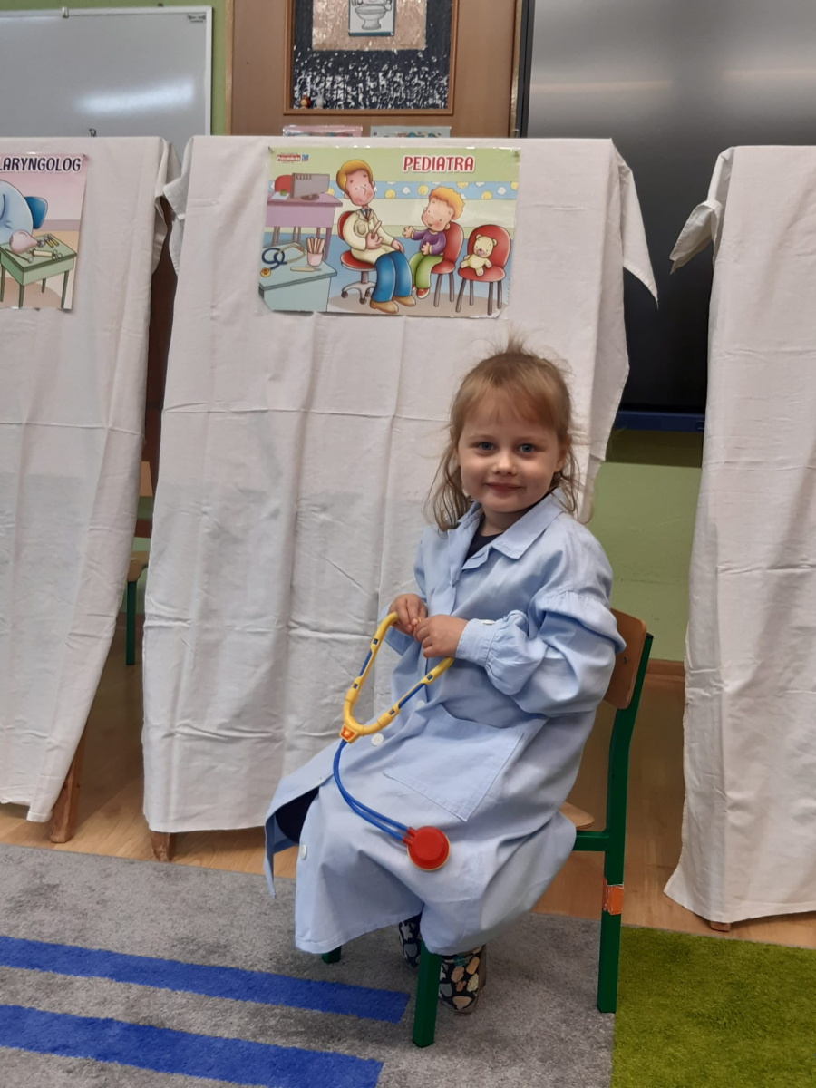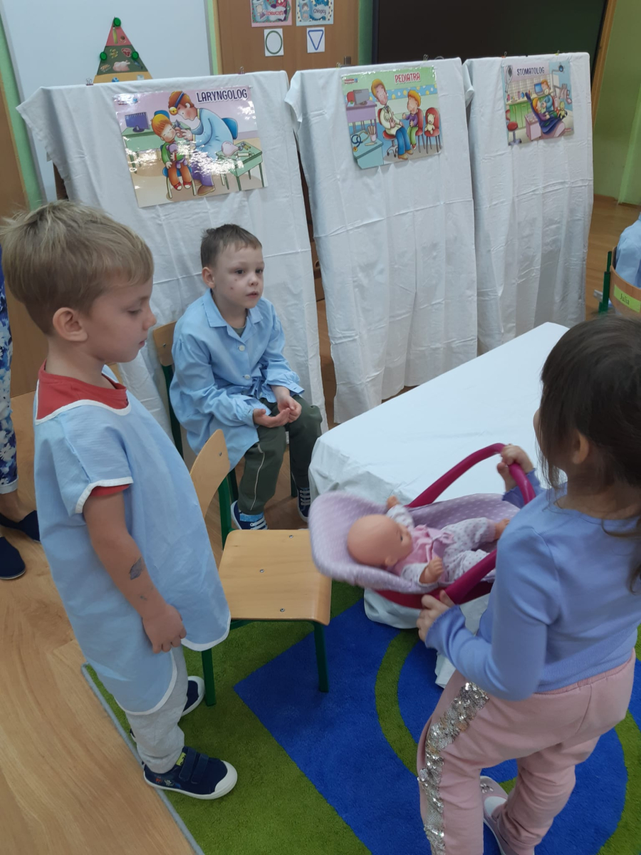 Podczas zajęć, grupa Zajączków rozmawiała na temat chorowania i leczenia. Ponieważ niestety, każde z dzieci było kiedyś chore, to mogły podzielić się swoimi doświadczeniami i obawami związanymi z wizytą u lekarza. Podczas rozmów na ten temat dzieci dowiedziały się również, że swoje dolegliwości można leczyć u różnych lekarzy. Dzieci miały też okazję wcielić się w rolę różnych specjalistów i mogły leczyć swoich małych pacjentów. Zabawa sprawiła dzieciom ogromne radość i satysfakcję. Miejmy również nadzieję, że zajęcia pomogą dzieciom w przyszłości przezwyciężyć lęk podczas wizyty u lekarza. Na koniec aby utrwalić wiedzę dotycząca dbania o ząbki, dzieci wykonała pracę plastyczną. Powstały radosne buzie pełne zdrowych i zadbanych zębów.