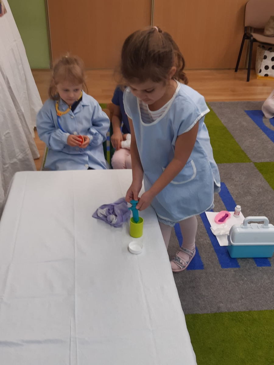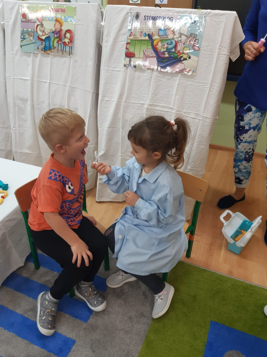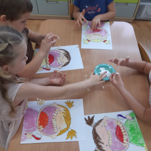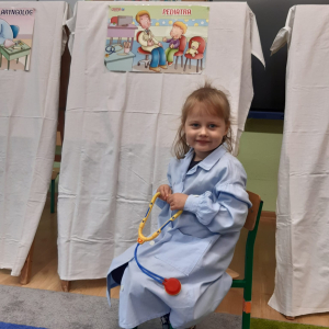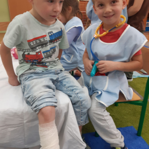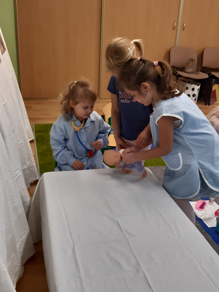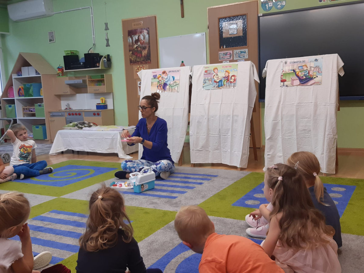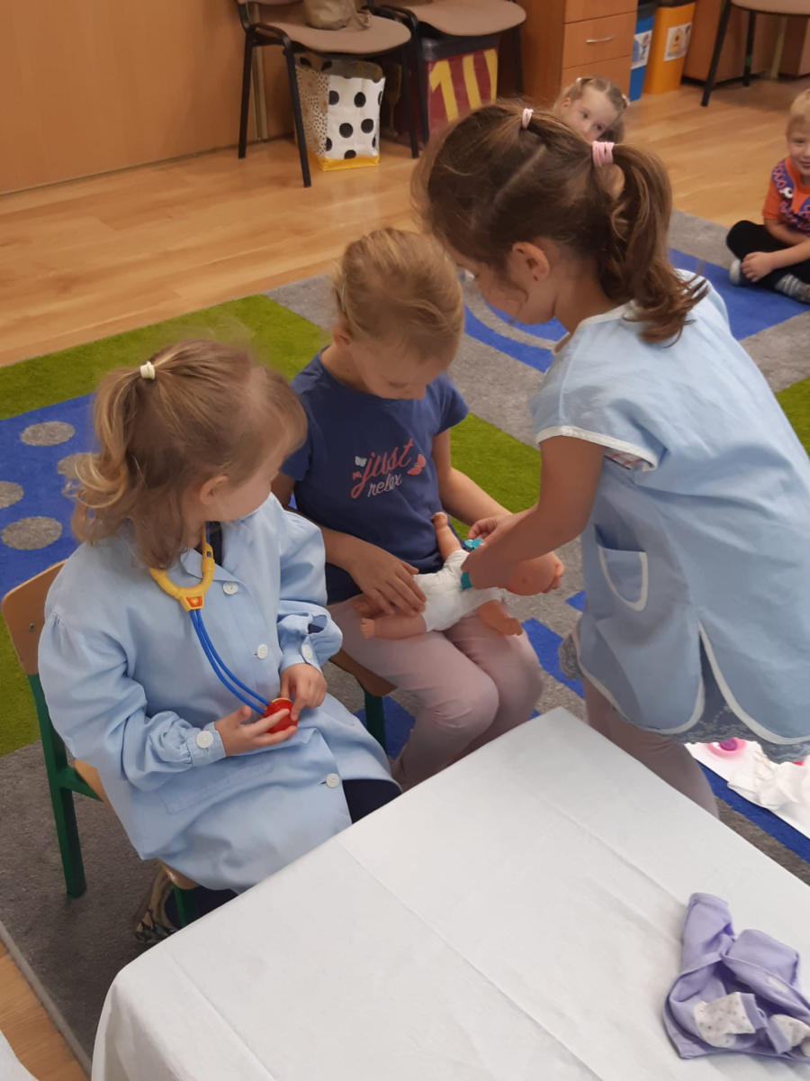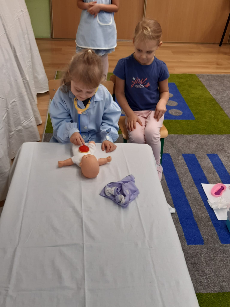 Podczas zajęć, grupa Zajączków rozmawiała na temat chorowania i leczenia. Ponieważ niestety, każde z dzieci było kiedyś chore, to mogły podzielić się swoimi doświadczeniami i obawami związanymi z wizytą u lekarza. Podczas rozmów na ten temat dzieci dowiedziały się również, że swoje dolegliwości można leczyć u różnych lekarzy. Dzieci miały też okazję wcielić się w rolę różnych specjalistów i mogły leczyć swoich małych pacjentów. Zabawa sprawiła dzieciom ogromne radość i satysfakcję. Miejmy również nadzieję, że zajęcia pomogą dzieciom w przyszłości przezwyciężyć lęk podczas wizyty u lekarza. Na koniec aby utrwalić wiedzę dotycząca dbania o ząbki, dzieci wykonała pracę plastyczną. Powstały radosne buzie pełne zdrowych i zadbanych zębów.