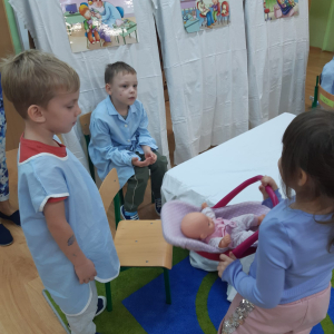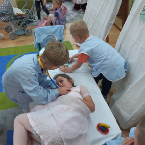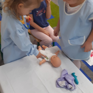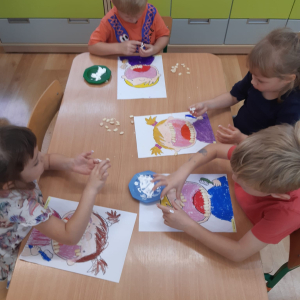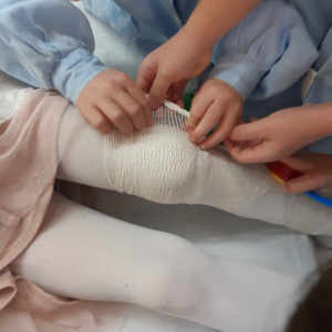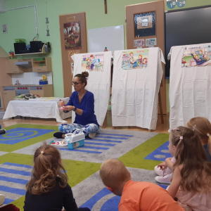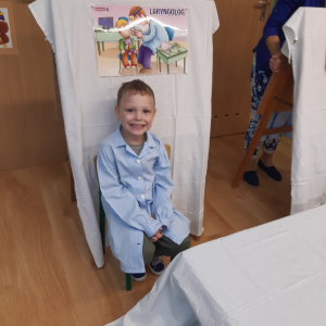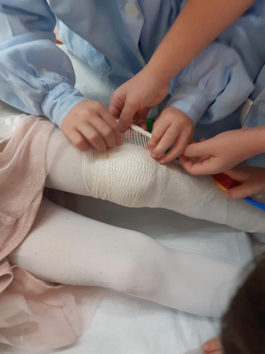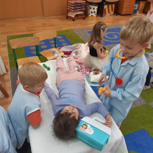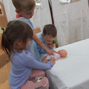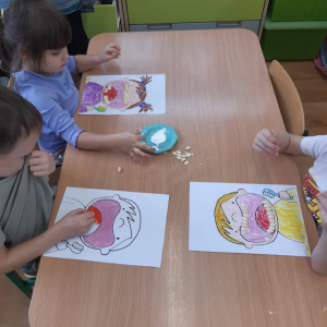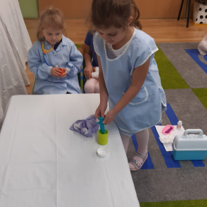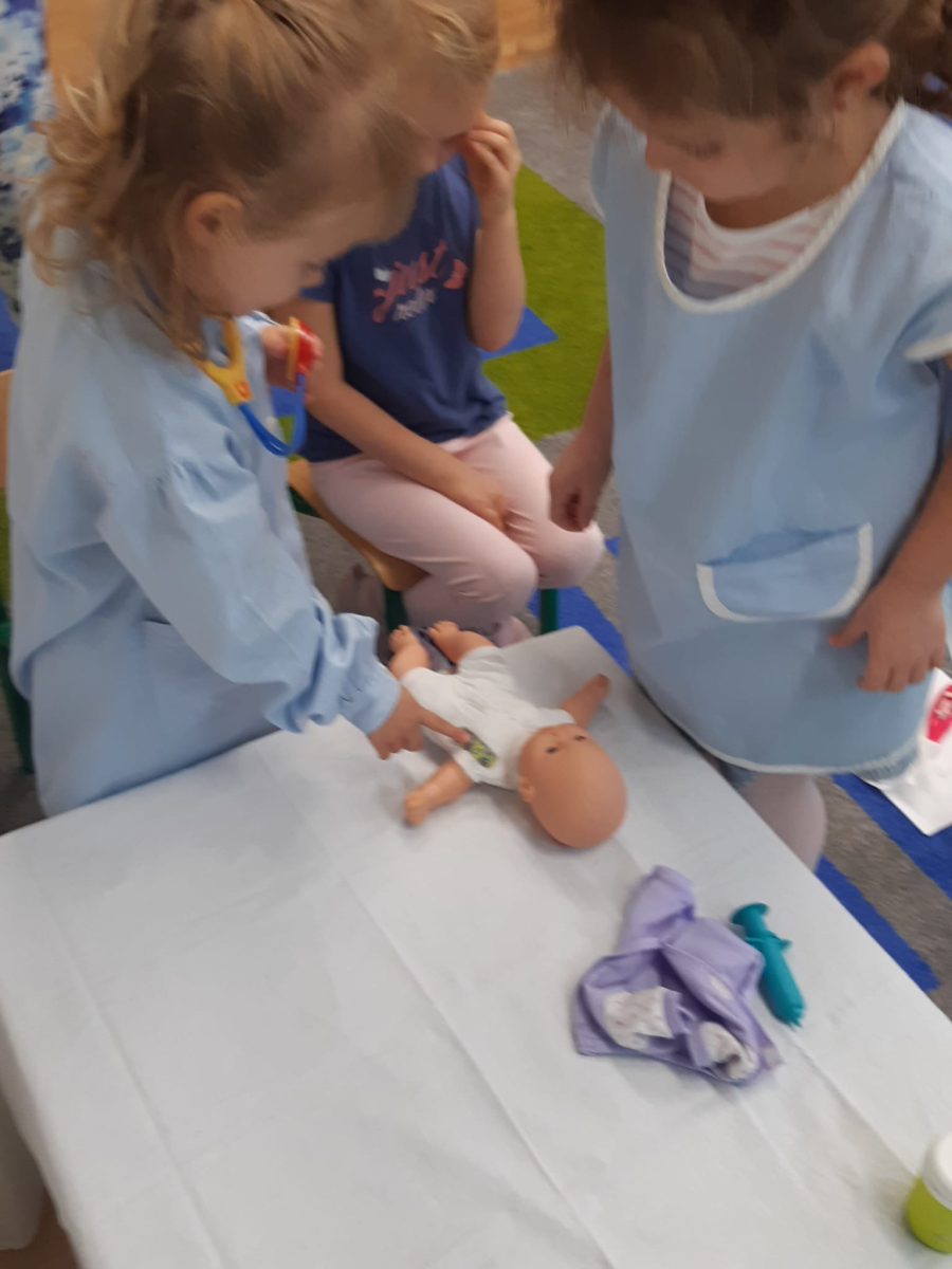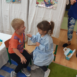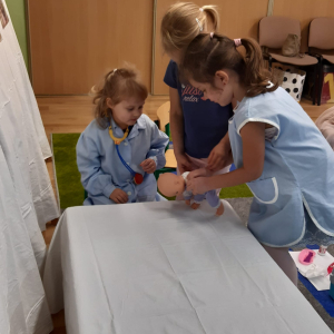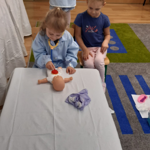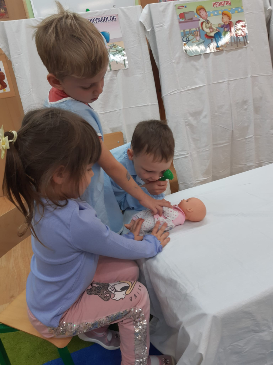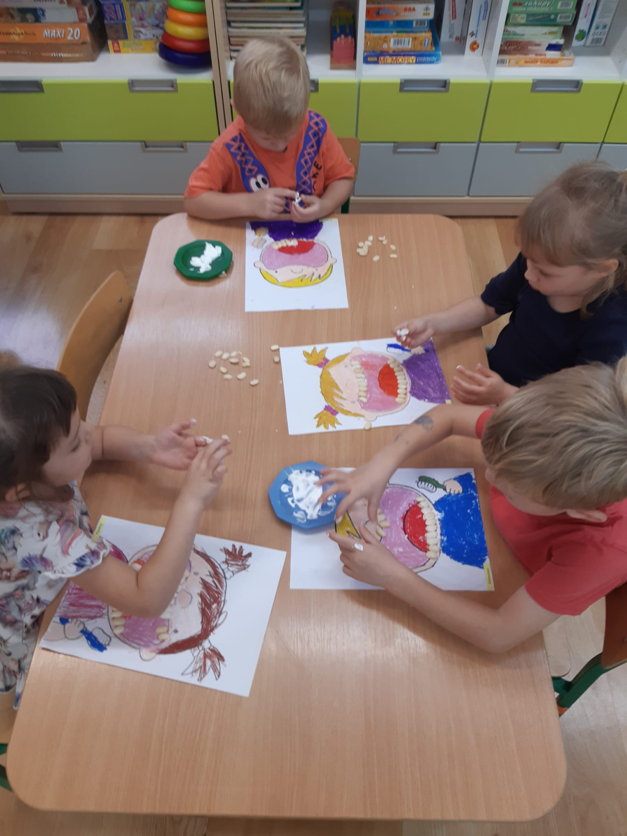 Podczas zajęć, grupa Zajączków rozmawiała na temat chorowania i leczenia. Ponieważ niestety, każde z dzieci było kiedyś chore, to mogły podzielić się swoimi doświadczeniami i obawami związanymi z wizytą u lekarza. Podczas rozmów na ten temat dzieci dowiedziały się również, że swoje dolegliwości można leczyć u różnych lekarzy. Dzieci miały też okazję wcielić się w rolę różnych specjalistów i mogły leczyć swoich małych pacjentów. Zabawa sprawiła dzieciom ogromne radość i satysfakcję. Miejmy również nadzieję, że zajęcia pomogą dzieciom w przyszłości przezwyciężyć lęk podczas wizyty u lekarza. Na koniec aby utrwalić wiedzę dotycząca dbania o ząbki, dzieci wykonała pracę plastyczną. Powstały radosne buzie pełne zdrowych i zadbanych zębów.