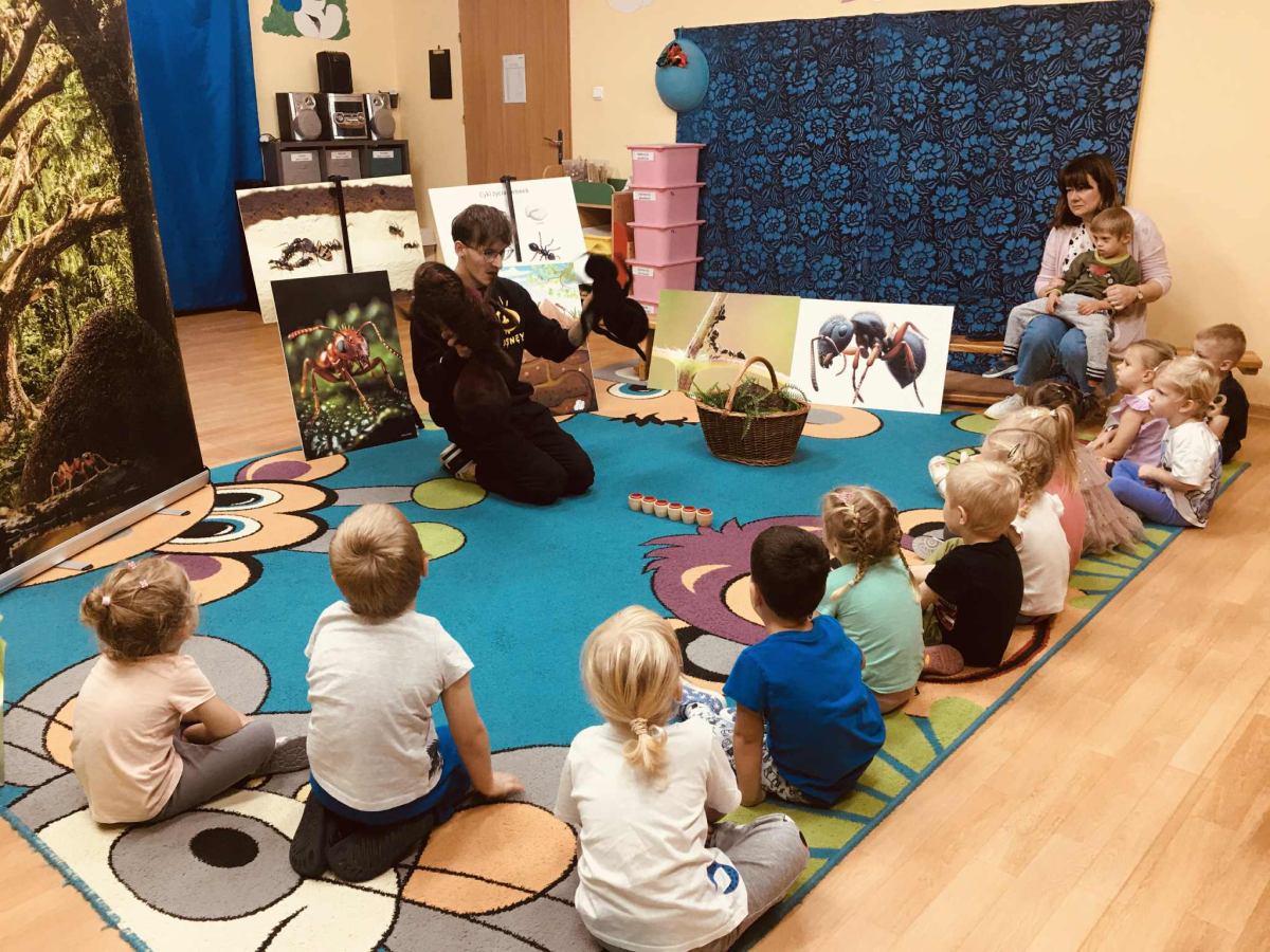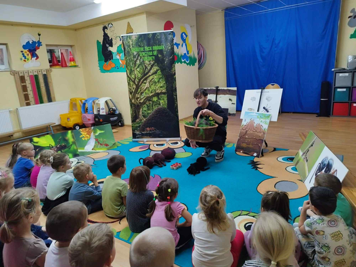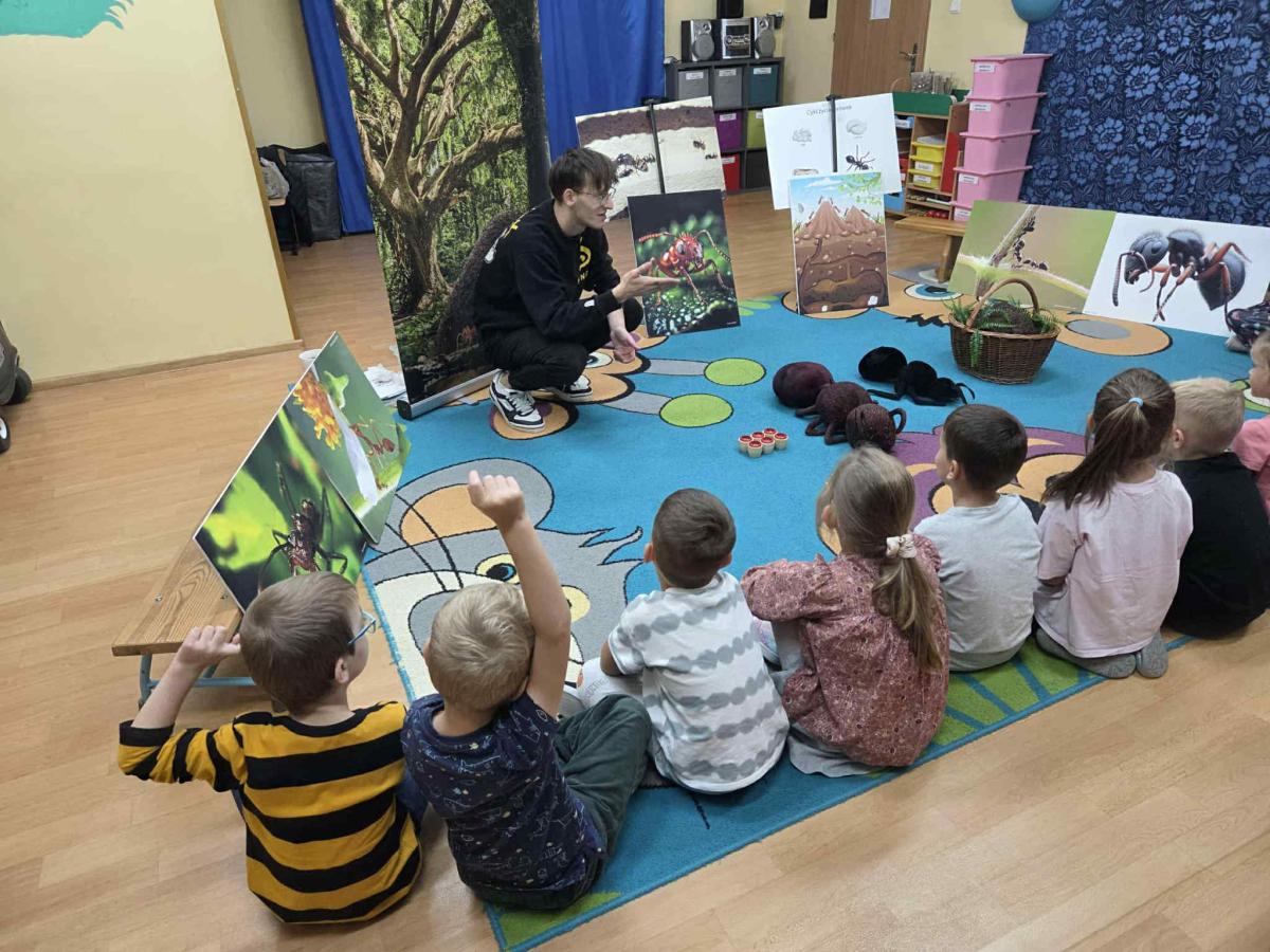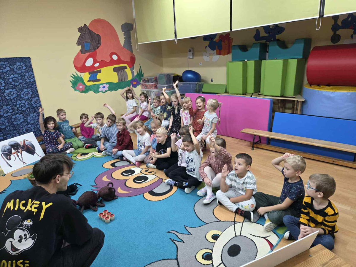 Nasze przedszkolaki wzięły udział w niezwykle ciekawych warsztatach edukacyjnych pt. „Sekretne życie mrówek” podczas których dzieci miały okazję poznać fascynujący świat tych małych, ale bardzo pracowitych owadów. Przedszkolaki dowiedziały się wielu interesujących informacji na temat różnych gatunków mrówek, ich kolorów, sposobów odżywiania oraz życia codziennego. Z ogromnym zainteresowaniem obserwowały żywe mrówki w specjalnych pojemnikach oraz miały niepowtarzalną okazję zobaczyć królową mrówek. Dzieci poznały także budowę mrówki, dowiedziały się, jak wyglądają podziemne korytarze i jak powstają mrówcze kopce. Warsztaty wzbudziły wiele emocji, pytań i ciekawości – z pewnością na długo zostaną w pamięci naszych małych odkrywców!