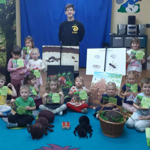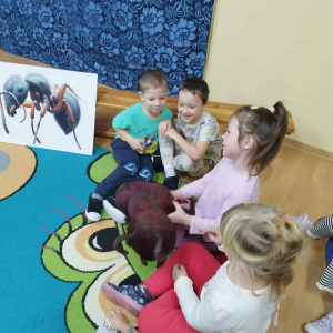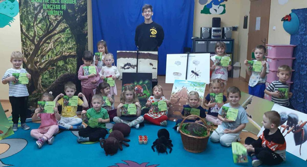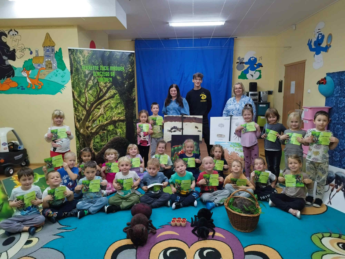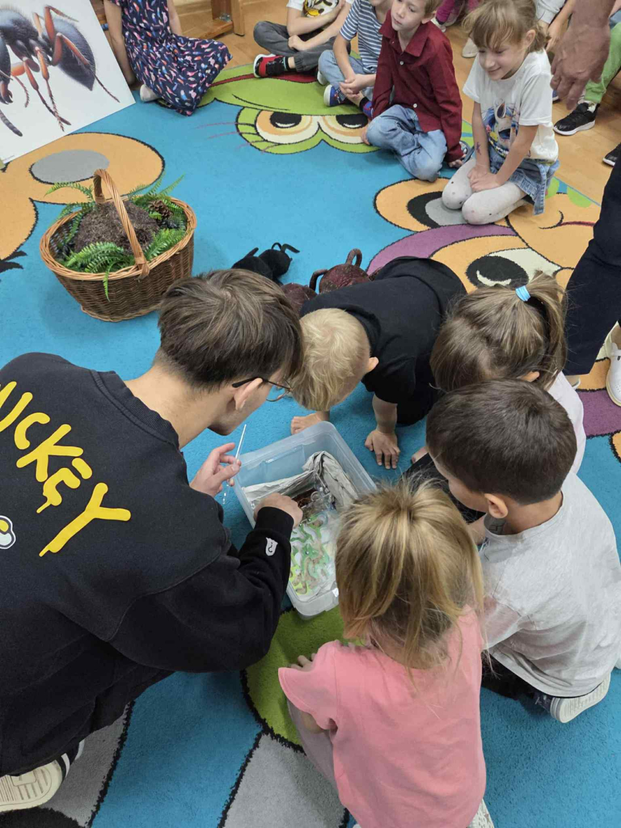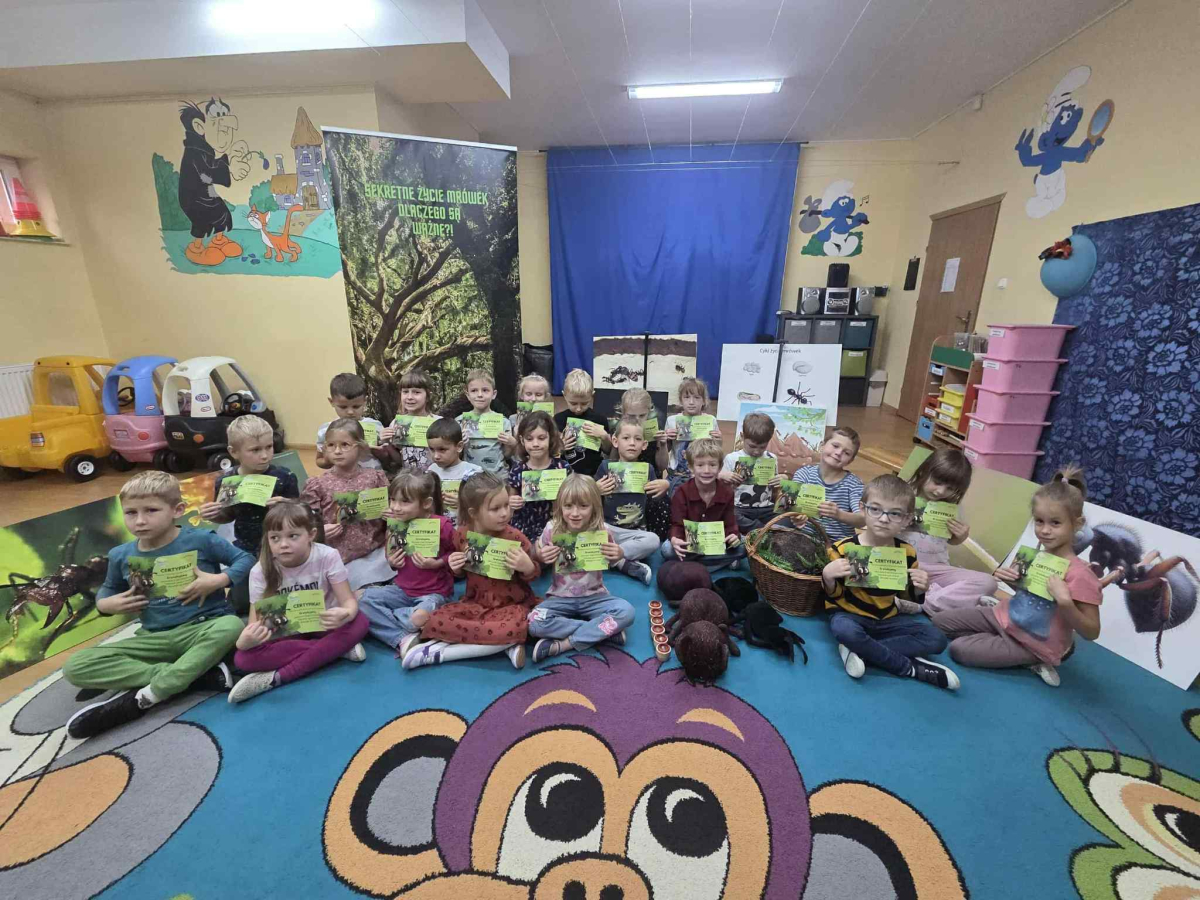 Nasze przedszkolaki wzięły udział w niezwykle ciekawych warsztatach edukacyjnych pt. „Sekretne życie mrówek” podczas których dzieci miały okazję poznać fascynujący świat tych małych, ale bardzo pracowitych owadów. Przedszkolaki dowiedziały się wielu interesujących informacji na temat różnych gatunków mrówek, ich kolorów, sposobów odżywiania oraz życia codziennego. Z ogromnym zainteresowaniem obserwowały żywe mrówki w specjalnych pojemnikach oraz miały niepowtarzalną okazję zobaczyć królową mrówek. Dzieci poznały także budowę mrówki, dowiedziały się, jak wyglądają podziemne korytarze i jak powstają mrówcze kopce. Warsztaty wzbudziły wiele emocji, pytań i ciekawości – z pewnością na długo zostaną w pamięci naszych małych odkrywców!